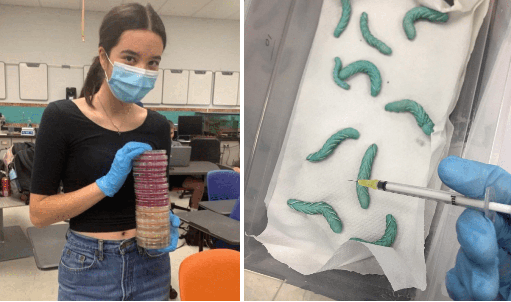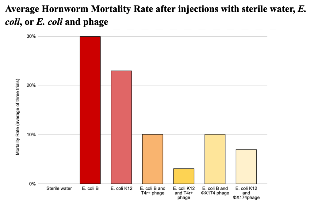 Abstract: Bacteriophages are naturally occuring bactericidal viruses whose high host-specificity allows them to target specific bacteria. As populations of antibiotic-resistant bacteria grow, phage therapy is a promising alternative to antibiotics that may also have fewer negative consequences for the overall microbiome. Manduca sexta will be used to test the efficacy of bacteriophage, antibiotic, and combination treatment of systemic E. coli infections within a living system. It is hypothesized that bacteriophage therapy will reduce deaths as a result of E. coli infection in the chosen model for this experiment, the tobacco hornworm (Manduca sexta). Hornworms treated with bacteriophage will resist infection as effectively as antibiotic treatment, bacteriophage therapy will enhance the effectiveness of low-dose antibiotics, and bacteriophage therapy will have fewer negative consequences for overall hornworm health. Qualitative data collected will determine the most effective treatment, and immune responses of the hornworms will be observed through hemocyte (immune cell) abundance and genetic analysis of the insects’ microbiome before, during, and after infection. Evaluating the efficacy, benefits, and potential drawbacks of bacteriophage therapy is essential because it is a proposed alternative treatment option for bacterial infection in humans.